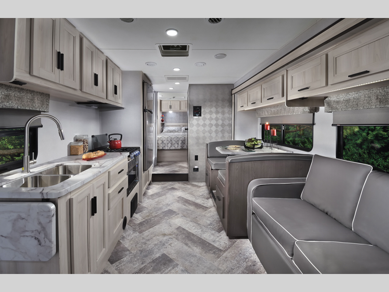 Sleeps 6 Slides 2 Length 29 ft 4 in Ext Width 8 ft 5 in Ext Height 11 ft 4 in Hitch Weight 7500 lbs GVWR 14500 lbs Fresh Water Capacity 44 gals Grey Water Capacity 33 gals Black Water Capacity 32 gals Furnace BTU 30000 btu Generator 4.5KW Gas Fuel Type Gas Chassis Ford E450 Fuel Capacity 55 gals Wheelbase 190 in Number Of Bunks 1 Available Beds Queen Refrigerator Type 12V Refrigerator Size 10.7 cu ft Cooktop Burners 3 Shower Size 24" x 32" Number of Awnings 1 Axle Weight Front 5000 lbs Axle Weight Rear 9600 lbs LP Tank Capacity 41 lbs Water Heater Capacity 6 gal Water Heater Type DSI Gas/Electric AC BTU 15000 btu TV Info LR 12V LED Awning Info 12'6" Power w/ LED Light Strip Gross Combined Weight 22000 lbs Shower Type Standard Electrical Service 30 amp Similar Floorplans