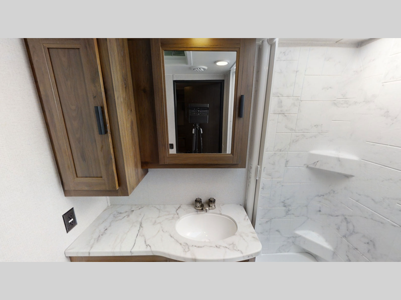 Durable construction includes SuperLite composite substrate, block foam insulation, a crowned, laminated fiberglass roof, and a one-piece seamless fiberglass cap. Some top features include a backup camera/side view cameras with a 3-way monitor, blackout roller shades, soft touch self-closing drawer guides, and much more!