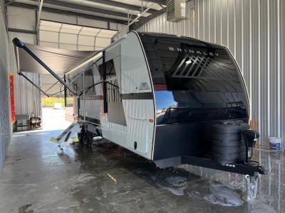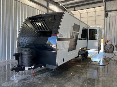 The lightweight Model I travel trailer by Brinkley is the perfect choice for those looking for an easy tow and at-home comforts! There is a drop-frame chassis, high-performance Road Armor suspension equalizer system, and Demco EZ Latch trailer coupler that automatically latches when dropped onto a hitch ball without the need of a safety pin. Additional exterior features include square Euro frameless windows, automotive-grade paint, full-width LED strip lighting in the pass-thru, and a pet & property security campside tie-down to keep your gear and furry friends safe. Inside, you'll be wowed by Brinkley's CraftSense wood trim construction, residential solid surface kitchen countertops, dimmable bedroom lights, and marine-grade neon LED shower lighting to name a few stand-out features!