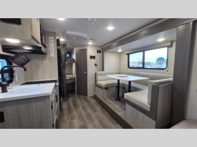 This spacious travel trailer can sleep eight campers each night thanks to the double-size bunks in the back, the U-shaped dinette within the slide out, and the queen bed up front! You can easily make meals for your crew with the two burner cooktop and microwave oven, and leftovers can go in the 10.7 cu. ft. 12V refrigerator! After you've cleaned up in the full bath, head outdoors to relax under the 15' power awning with multicolor LED lights and a remote!