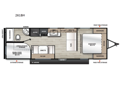 You get to choose to sit at the sofa or at the booth dinette when you are relaxing inside. There is a shelf with storage totes above the sofa for your belongings, and an additional overhead cabinet above the dinette for games. Maybe you want to rest on your own queen bed in the front semi-private bedroom before you make a meal in the kitchen or take a hike through the trails around the lake. The 15' electric awning with multi-color LED lights and a remote offers an outdoor living area where you can visit with other RVers. The kids will love their own double-size bunks that they can share with a friend or two, and the full bathroom is nearby as an added convenience.