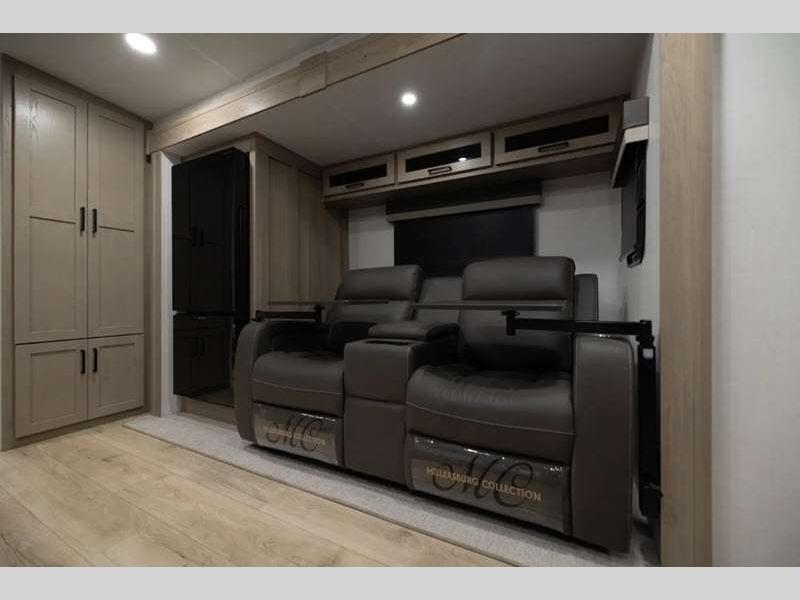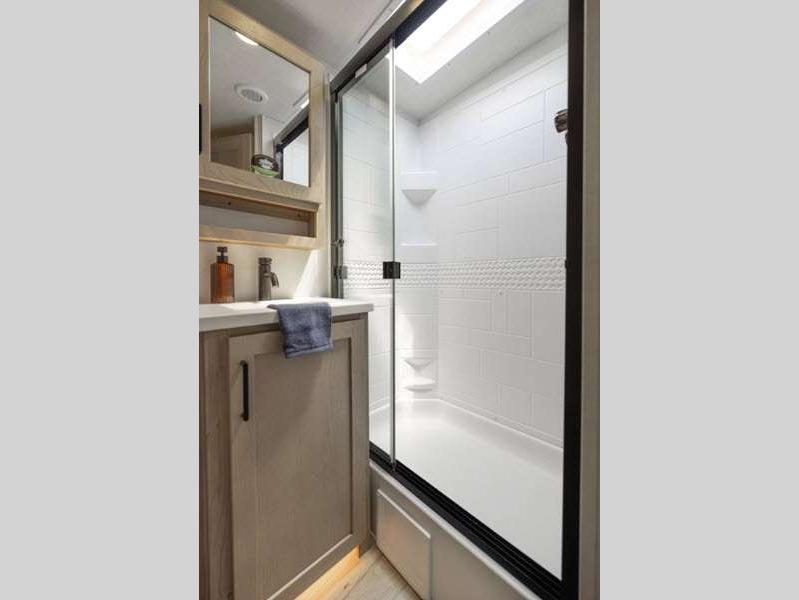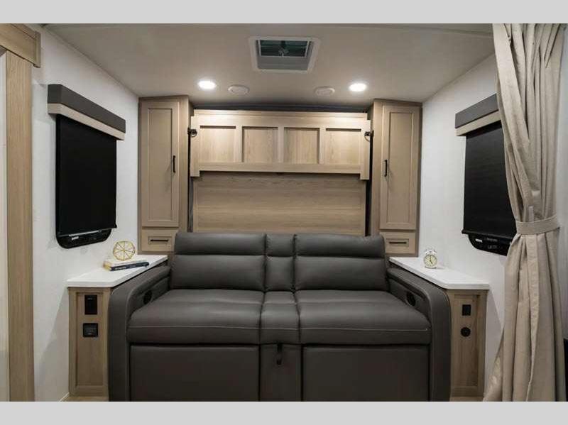 Each model is constructed with a fully laminated walkable roof, 6-sided full-aluminum frame, and a fiberglass front cap with Clear Coat for added protection. You will appreciate the slam baggage doors and 200W solar panel outside, plus there is a Climate Protection Package for better insulation. Inside, you'll love the solid surface countertops, roller shades, and soft close roller bearing drawers.