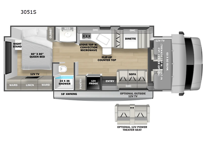 Sleeps 6 Slides 2 Length 30 ft 9 in Ext Width 8 ft 5 in Ext Height 11 ft 3 in Interior Color Marble, Fieldstone Exterior Color Standard Graphics. Full Body Paint; Sapphire, Scarlet Hitch Weight 7500 lbs GVWR 14500 lbs Fresh Water Capacity 44 gals Grey Water Capacity 39 gals Black Water Capacity 39 gals Furnace BTU 30000 btu Generator 4.0KW Gas Fuel Type Gas Chassis Ford Fuel Capacity 55 gals Wheelbase 202 in Number Of Bunks 1 Available Beds RV Queen Refrigerator Type 12V Refrigerator Size 10.7 cu ft Convection Cooking Yes Cooktop Burners 3 Shower Size 24" x 36" Number of Awnings 1 Axle Weight Front 5000 lbs Axle Weight Rear 9600 lbs LP Tank Capacity 41 lbs. Water Heater Capacity 6 gal Water Heater Type DSI Gas/Electric AC BTU 13500 btu TV Info BR 12V, Bunk 12V LED Awning Info 14' Power w/ LED Lights Gross Combined Weight 22000 lbs Shower Type Standard Electrical Service 30 amp Similar Floorplans