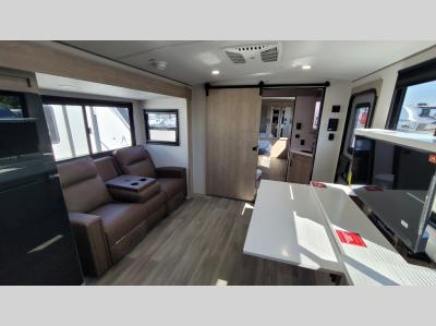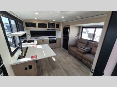 At the front of the 2700BS trailer, you’ll find a spacious full bedroom featuring a 70" x 80" king bed housed in one of two slide outs, offering both generous space and a comfortable night’s rest. The room also includes a wardrobe and dresser, providing ample storage for clothing and essentials. Moving toward the center, the walk-through bathroom boasts a 30" x 36" residential walk-in shower with a skylight, a toilet, and a sink opposite a mirrored medicine cabinet for added convenience and storage. At the rear, the open-concept kitchen and living area make excellent use of the second slide out, which includes cozy theater seating, perfect for dining or relaxing while watching TV. Next to it sits a 10-cu. ft. refrigerator, offering plenty of room for groceries and refreshments. Across the space, the L-shaped kitchen spans the entire rear wall, giving you extensive countertop room for meal prep. Equipped with a three-burner range, oven, microwave, and stainless steel sink, this kitchen allows you to cook in comfort and style without relying on campsite facilities.