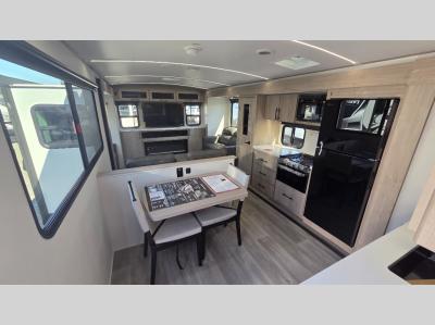 The rear living room on this Imagine travel trailer is just what you'll want when you're looking for a little down time. This room has opposing tri-fold sofas within slides, theater seating, and a TV. Another place that you can sit down at is the free-standing adjustable dinette. You can sit here with a fresh cup of coffee in the afternoon as you map out your hike for tomorrow. The kitchen offers you a flip-up countertop extension, a microwave, a three-burner range with oven, a 10-cubic foot 12V refrigerator, and pantry to help you make meals, and there is a private bedroom with a 60" x 80" bed to rest on at the end of the day.
