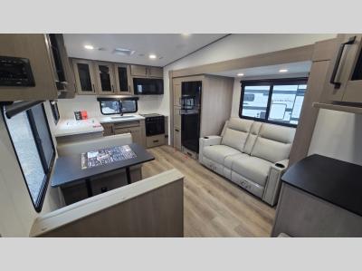 At the front of this fifth wheel, a private bedroom offers a walk-around 60" x 80" queen bed for restful comfort, complemented by dual wardrobes for convenient clothing storage. Down the hall, the full bathroom includes a 30" x 36" residential walk-in shower, a large, mirrored medicine cabinet, and linen storage for towels and toiletries. The middle living area features a cozy fireplace and booth dinette with a TV above perfect for dining while enjoying your favorite shows. Opposite, a slide-out holds the 62" theater seating for relaxing after a day of adventure, alongside a 10-cu. ft. refrigerator and pantry for all your groceries and dry goods. At the rear, an L-shaped kitchen provides generous counter space, a deep-seated stainless-steel sink, and a 30" microwave, allowing you to prepare meals comfortably without relying on campground facilities.