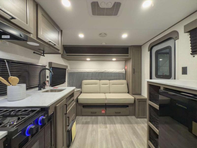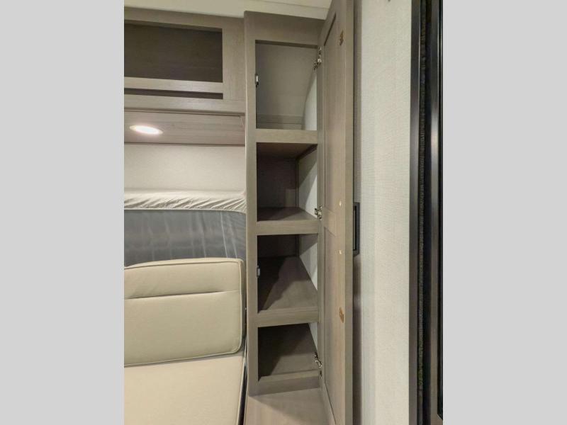 Sleeps 7 Slides 1 Length 23 ft Ext Width 8 ft Ext Height 10 ft 6 in Int Height 6 ft 6 in Hitch Weight 524 lbs GVWR 5500 lbs Dry Weight 4784 lbs Fresh Water Capacity 37 gals Grey Water Capacity 74 gals Black Water Capacity 37 gals Tire Size ST225/75R15LRE Furnace BTU 20000 btu Number Of Bunks 2 Available Beds Queen Murphy Bed Refrigerator Type Glass Front 12V Refrigerator Size 10 cu ft Cooktop Burners 2 Shower Size 27" x 36" Number of Awnings 1 LP Tank Capacity 20 lbs Water Heater Capacity 6 gal Water Heater Type Gas/Electric AC BTU 13500 btu Awning Info 16' Power w/Fusion Light Axle Count 1 Number of LP Tanks 1 Shower Type Walk-In Shower Similar Floorplans