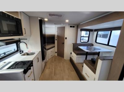 Spacious and versatile, this travel trailer is perfect for getaways to the campground or relaxing escapes by the lake! There is a front Murphy bed with storage on both sides plus a pull-out pet dish to keep your furry friends happy. Your guests or little ones will love the double-size bunks, and the full bath is right next to the bunks for easy nighttime use. Once you make breakfast on the two burner range, you can dine at the booth dinette slide. And this model also includes an outdoor griddle and refrigerator if you want to make breakfast outdoors. Additional exterior features include a 16' power awning, an interior/exterior table, and a pass-thru storage for larger camp gear.