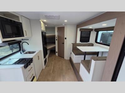 This travel trailer is perfect for getaways to the campground or relaxing escapes by the lake! There is a front queen bed with generous storage both above and below. Your guests or little ones will love the double-size bunks, and the full bath is right next to the bunks for easy nighttime use. Once you make breakfast on the two-burner range, you can dine at the booth dinette slide. An interior/exterior table provides more dining space when you need it, and a 15' power awning with a fusion light lets you stay up late to visit with friends!