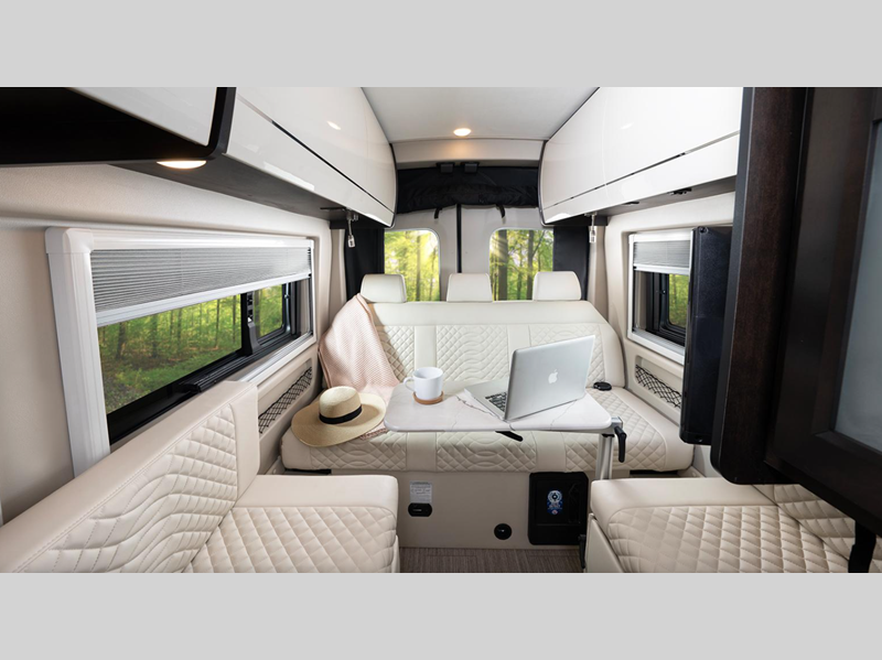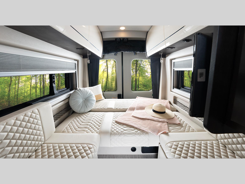 Sleeps 2 Length 22 ft Ext Width 7 ft 2 in Ext Height 10 ft Int Height 6 ft 6 in Interior Color Crown Point GVWR 11000 lbs Fresh Water Capacity 28 gals Grey Water Capacity 26 gals Black Water Capacity 16 gals Tire Size 205/75R16C BSW All Season Furnace BTU 20000 btu Generator 2800W Gas Fuel Type Gasoline Engine 3.5L EcoBoost V6 Chassis Ford Transit AWD 350HD Horsepower 310 hp Fuel Capacity 25 gals Wheelbase 148 in Available Beds Twin Beds with Bed Conversion Torque 400 ft-lb Refrigerator Size 3.1 cu ft Cooktop Burners 1 Shower Size 25" x 47" Water Heater Type Truma Combi Eco Plus AC BTU 13500 btu TV Info LR 24" LED HD Smart TV Awning Info Carefree Armless with LED Lights Gross Combined Weight 13000 lbs Shower Type Wet/Bath Shower Electrical Service 30 amp Solar Wattage 200 watts Similar Floorplans