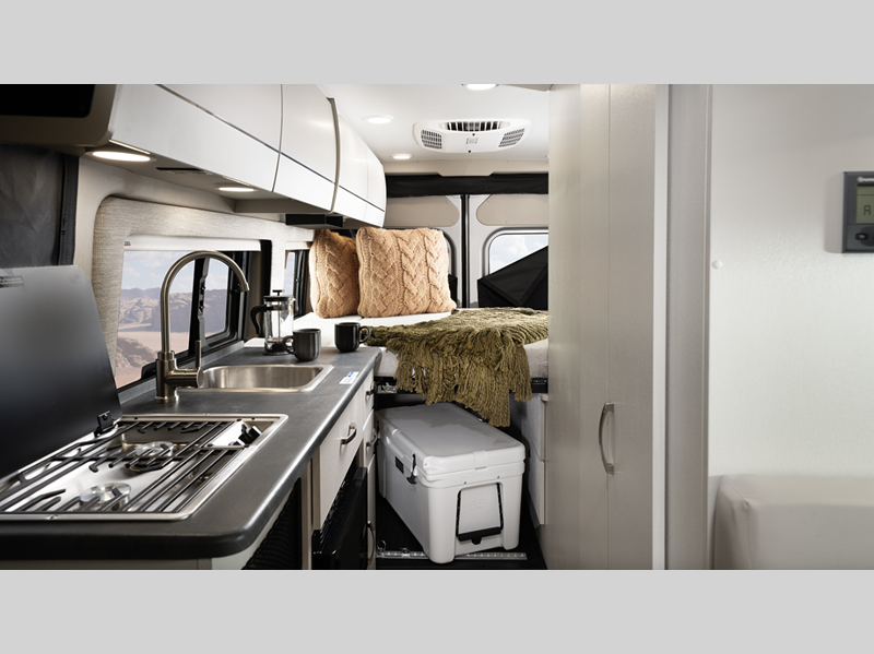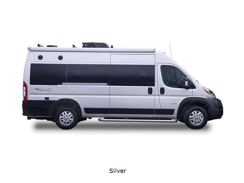 Sleeps 2 Length 20 ft 11 in Ext Width 6 ft 11 in Ext Height 9 ft 3 in Int Height 6 ft 2 in Interior Color Caricou Exterior Color Granite, Silver Hitch Weight 3500 lbs GVWR 9350 lbs Fresh Water Capacity 24 gals Grey Water Capacity 13 gals Black Water Capacity 12 gals Tire Size LT225/75R16E Furnace BTU 20000 btu Generator 2,800-watt Onan Fuel Type Gasoline Engine 3.6L V6 24V VVT Chassis Ram ProMaster 3500 Van Horsepower 276 hp Fuel Capacity 24 gals Wheelbase 159 in Available Beds Two Twin with King Conversion Torque 250 ft-lb Refrigerator Type DC Refrigerator Size 3.1 cu ft Convection Cooking Yes Shower Size 25" x 43" Number of Awnings 1 Water Heater Type Truma Combi Eco Plus AC BTU 13500 btu Awning Info 13' Thule Armless w/LED Light Strip Gross Combined Weight 12000 lbs Shower Type Wet/Bath Shower Electrical Service 30 amp Similar Floorplans