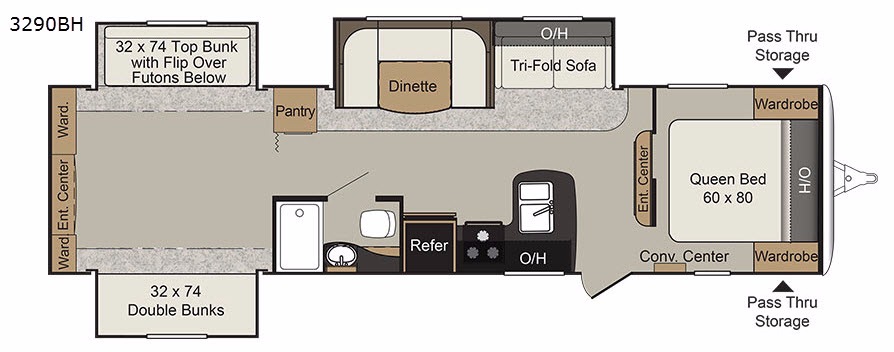 If you have been searching for a spacious bunkhouse for the kids and their friends to call their own, and a private bedroom for yourself, your search is over! This Passport 3290BH Grand Touring travel trailer offers plenty of usable space in this triple slide out model. The kids will enjoy the entertainment center, storage, and wide open bunkhouse with flip over futons and triple bunk beds. You will surely appreciate the two wardrobes and convenience center in the front bedroom for all your clothes and necessary items. As you all meet in the middle to make dinner, play games, or relax on a rainy day, you will find the spacious area fits your family perfectly. Take a look today.